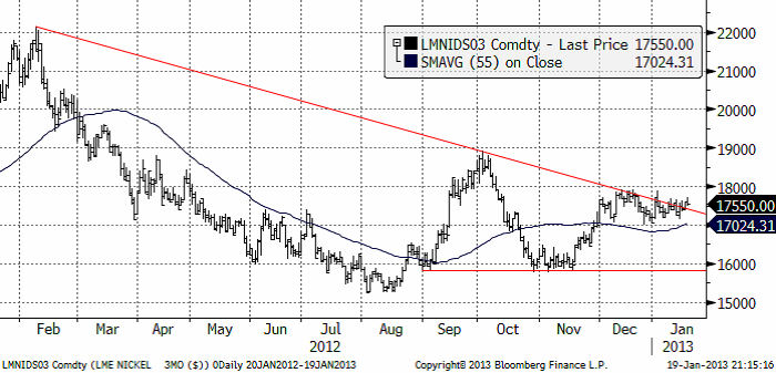 De senaste fundamentala rapporter vi tagit del av tyder på en marknad i balans under Q1 2013, detta tack vare att vi är inne i den säsongsmässigt starka perioden. Studier som genomförts styrker vår anekdotiska erfarenhet att perioden nov-april brukar innebära ökad efterfrågan (och stigande nickelpris). Problemet just nu är att utbudet är lite för överhängande för att ge tillräcklig hävstång på priset. Nickel kan dock erfarenhetsmässigt ofta överraska med sin prisrörlighet. Den tekniska bilden ser generellt positiv ut med en tendens till ”högre bottnar”. Det blir viktigt hur marknaden beter sig i intervallet $17000 och $18000 ($17550 i skrivandes stund). Det viktigt att den nedre nivån håller för att hålla uppe tempot. Bryter det på uppsidan kan det ta fart ordentligt på uppsidan.