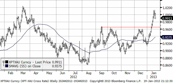 Nedan ser vi priset på platina i termer av guld, eller ”växelkursen” mellan XPT och XAU, valutakoderna för de två ädelmetallerna. Den här kvoten nådde förra årets toppnivåer i veckan som gick. Efter en god resa uppåt hittills i år, kan det kanske vara dags för vinsthemtagningar, tänker vi.