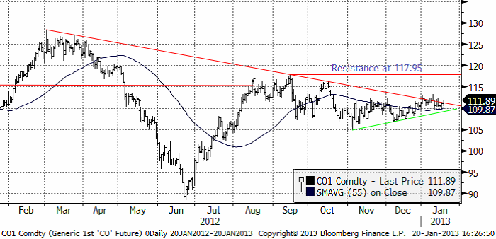 Tekniskt ser vi att en triangelformation bildats och den tycks brytas på uppsidan. På kort sikt finns det då potential upp mot motståndet på 117.95.