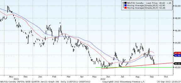 Elmarknaden har fortsatt nedåt och vi börjar närma oss nivåer för att börja bygga längd. Q1-13 terminen är senast omsatt på 40.70 EUR/MWh (tidigare kommunicerad target-nivå 40.00). Nedsidan börjar bli begränsad och vi står beredda på att köpa.