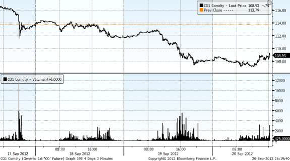 Wild moves yesterday. Brent crude traded to a high of $114.43/b and a low of $96.0/b and closed at $99.94/b yesterday.