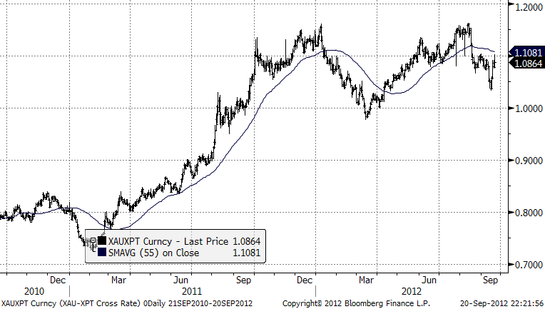 Nedan ser vi priset på guld dividerat med priset på platina. Vi ser att guld har utvecklats sämre än platina sedan mitten av augusti. Tekniskt ser den här trenden stark ut och har potential att gå från 1.05 till 1, dvs en outperformance på ytterligare 5% till platinas fördel. Det mesta av rörelsen från 1.15 är dock avklarad och platina har inte lång tid kvar att vara vår favorit bland ädelmetallerna.