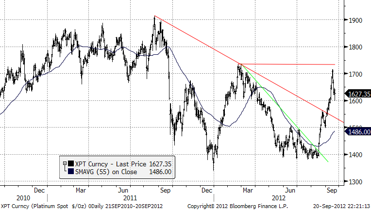 Nyheten att Strejken vid Lonmins gruva i Sydafrika avblåstes i början av veckan ledde till en massiv våg av vinsthemtagningar i platina. Priset har rekylerat ner ca 6 % sen toppen i förra veckan – detta efter en oavbruten uppgång sen mitten av augusti med mer än 20 % över perioden. Vi bedömer dagens nivå, strax över $1600, som klart köpvärd. Oroligheterna i Sydafrika, som står för 75 % av världsutbudet, är inte över, och strejkhoten hänger över fler gruvor efter Lonmins uppgörelse. Gruvorna har redan lönsamhetsproblem (går med förlust) och risken för fortsatt minskat utbud i landet är stor. Vi ser den här rekylen som ett köptillfälle.