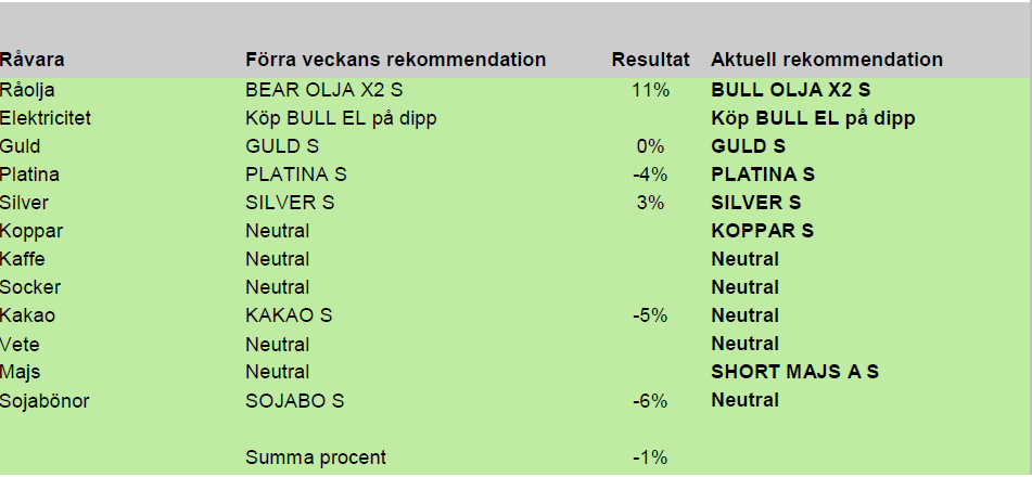 Summan av resultatet blev en liten förlust i veckan på -1%. Vi börjar bli något mer positiva till el jämfört med förra veckan. Efter rekylen i oljepriset är vi positiva till den också. Jordbruksprodukterna har successivt glidit över från köp- till neutral och nu sälj på majs. Möjligtvis kan det komma en rekyl upp på majs, vilket då blir ett säljtillfälle. För ädelmetaller är vi positiva. De gynnas på ett uppenbart sätt av monetär stimulans (“utan begränsning”) i USA, i Europa och i Japan.