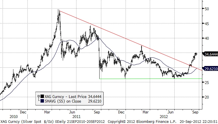 Nedan ser vi kursdiagrammet för silver i dollar per troy ounce.