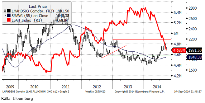 Lagren på LME minskar samtidigt med 5 – 10 kt om dagen. Det finns alltså inget tvivel om att det råder brist på aluminium-metall på marknaden och det gör att priset bör vara väl understött.