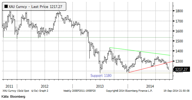 Tekniskt har guldpriset en bit ner till det tekniska stödet på 1180. Som vi skrev förra veckan är vi inte positivt inställda till att köpa guld i dollartermer.