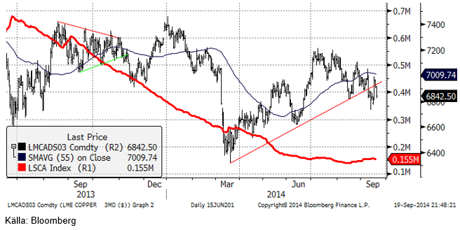 Fundamentalt väntar sig de flesta att ett överskott ska uppstå som sätter ytterligare press på priset. Bevis på detta finns dock inte riktigt ännu. LME-lagren har bottnat ut, verkar det som, vilket också är normalt under de mindre aktiva sommarmånaderna. Å andra sidan har cash-till-tremånaders pris gått ännu mer in i backwardation och 3 månaders termin är nu 40 dollar billigare än spot (kallat cash i LME-marknaden). Mer backwardation är vanligtvis ett tecken på ökande brist.