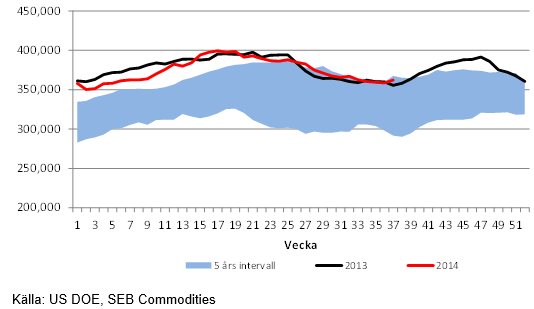 Råoljelagren i USA tycks ha börjat höstens lageruppbyggnad. Det är lite tidigare än förra året, men i stort sett i linje med det historiska genomsnittet. Lagren ökade med nästan 4 mbbl. Lagerökningen beror till viss del på högre import. Importen för veckan var den näst högsta hittills i år på 8,114 mbbl. Förra veckan var importen 7,621 mbbl.