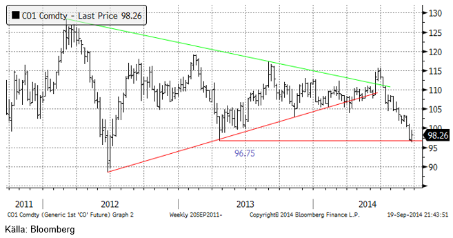 Nedan ser vi ett månadschart för de senaste tio åren. Vi ser att priset har brutit en triangelformation för två månader sedan. Det är enligt handboken i tekniska analys, en negativ signal. Det skulle dock inte förvåna om det kommer en rekyl upp mot 105 dollar innan priset slutligen vänder nedåt. En sådan rekyl uppåt blir i så fall ett bra säljtillfälle för dem som inte hann med att sälja för två månader sedan.