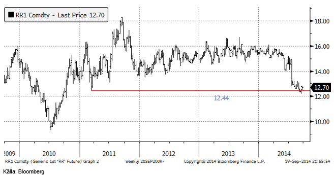 Priset på ris ligger kvar strax över det tekniska stödet på 12.44 dollar. Med de stora prisfall som varit i substitutet vete, skulle det inte förvåna om de senaste veckornas lugnare marknad är en konsolidering inför ytterligare ett prisfall i ris. Jag tycker man ska bevaka rismarknaden och vara beredd att köpa BEAR RIS X4 S om 12.44 eller 12.40 (helst) bryts. Nästa stöd finns ju som vi ser nere på 10 dollar.