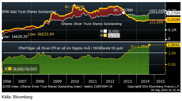 Investerare har sett mer positivt på silver än på guld en längre tid. Nedan ser vi ett exempel som illustrerar detta. Diagrammet visar hur många utestående andelar det finns i den ledande guldfonden och den ledande silverfonden, båda noterade på NYSE. Vi ser att intresset för silver drog ifrån guldet i samband med guldprisfallet under våren förra året. Trenden har fortsatt sedan dess.