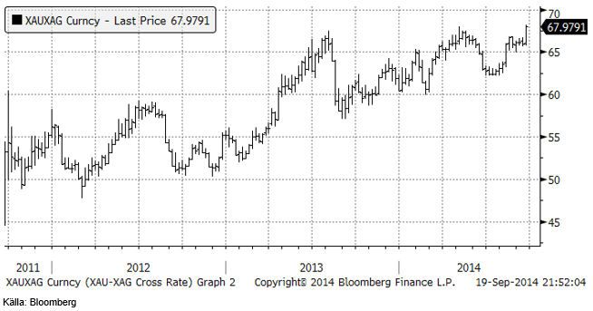 Silver är fortfarande ”billigt” i jämförelse med guld. Kvoten har legat på 66 gånger i flera veckor, men ökade efter fredagens kraftiga prisfall till nästan 68 gånger guldpriset.