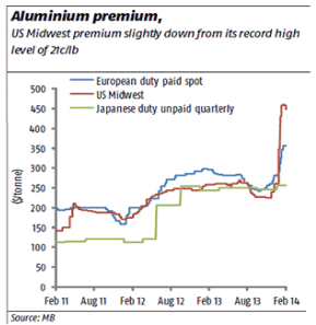 På den fysiska sidan, är allt fokus på premium-marknaden, där vi såg den första rekylen sedan början av året (se nedanstående diagram). Den höga premien för fysisk metall i USA attraherar material från Asien och Mellanöstern. Man började se lägre premier i den amerikanska Mellanvästern.