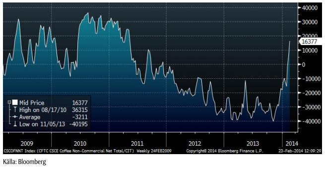 Vi går nu över till neutral rekommendation på kaffe. Volatiliteten kommer naturligtvis att fortsätta att vara hög och när nya produktionsestimat för Brasilien publiceras, ska man vänta sig att det bli stora rörelser. Den som är med på rätt sida av rörelsen kan tjäna stora pengar fort – och vice versa åt andra hållet. Troligtvis går torkan till historien som en av katastroferna i Brasiliens kaffehistoria. Hur stor, återstår att se.