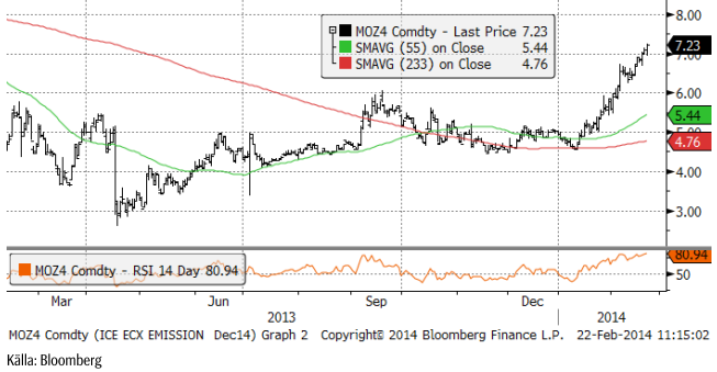Till de positiva nyheterna hör att priset på utsläppsrätter har stigit kraftigt sedan EU i januari beslutade att minska antalet rätter som tillhandahålls via statliga auktioner med 900 miljoner ton under 2014, 15 och 16. Det är tydligt att man vill ha ett pris som betyder något. Vi tror att ett sådant pris de tänker på är 15 – 20 euro per ton CO2. Om priset på utsläppsrätter fördubblas, kommer det att ha en effekt på prisutvecklingen på el i Kontinentaleuropa och därmed även i Norden.