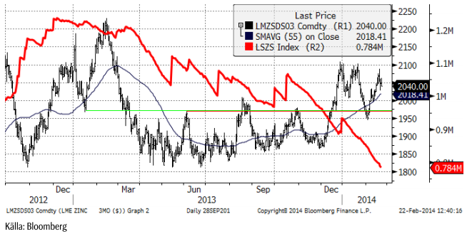 Efter en ganska volatil vecka, stängde zinkpriset i fredags på oförändrat pris. Statistik från ILZSG för helåret 2013 visade ett sammanlagt underskott på 60 kt. Jämfört med 2012 betyder detta en förändring på 290 kt, vilket mer eller mindre motsvaras av netto-uttagen från LME-lagret. Precis som är fallet för koppar, frågar sig marknaden om det här materialet går till konsumtion just nu eller om det bara flyttas till ett annat lager, som är billigare och underlättar lönsamheten i finansieringsaffärer. Som vi har noterat förut, finns risk att materialet har flyttats till lagerhus i Kina antingen som säkerhet/pant och/eller som del av en finansieringsaffär. Det ska bli intressant att se om materialet kommer ut igen på marknaden om terminskurvan blir mindre förmånlig för finansieringsaffärer. Vi tycker att kurvan ser ”billig”, vilket är attraktivt för investerare via terminsmarknaden.