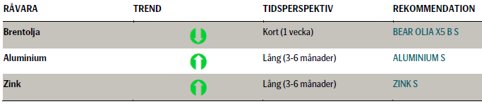 Den svagare prisutvecklingen har dämpats något av en starkare dollar. Icke desto mindre föll priserna räknat i kronor relativt kraftigt i veckan: cirka 1,8 procent för aluminium respektive cirka 4 procent för zink. Ur ett tekniskt perspektiv har zinkpriset fallit till stödnivån 2050 US-dollar per ton. Aluminium har i skrivande stund brutit genom och är under stödet vid 1800 US-dollar per ton, vilket öppnar upp för en ytterligare potentiell nedgång mot ca 1750 US-dollar per ton. Vår rekommendation på metallerna är på tre till sex månaders sikt, och vi begränsar oss till certifikat utan hävstång.