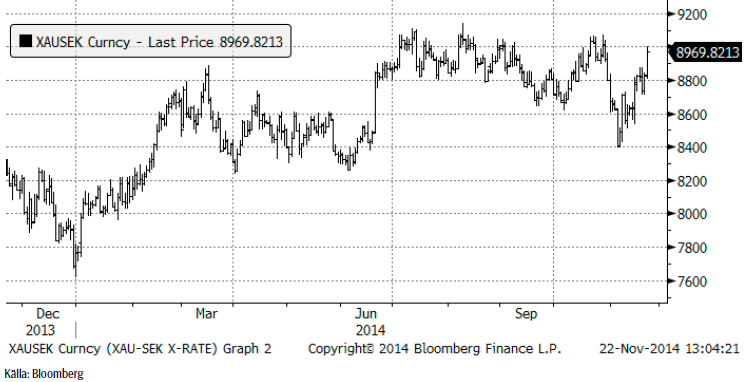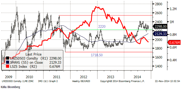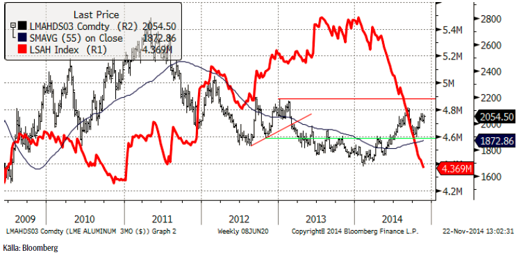 På samma tema som förra veckan, om hypotesen att Kinas strategiska reserv, SRB, successivt köper koppar, kom i veckan en artikel i Wall Street Journal som handlade om detta. En analytiker som intervjuas i artikeln, säger att planen kan vara att köpa upp till 2 miljoner ton koppar! Enligt artikeln har köpen hittills i år uppgått till 0.5 miljoner ton. Det stämmer överens med vad du kunde läsa här förra veckan (överensstämmer med hur mycket i lagerhus utanför LME som ”försvunnit”, enligt Metal Bulletin). Metal Bulletin har samlat ihop produktionsdata för det tredje kvartalet och skriver i sin senaste rapport, att kvartalet i sin helhet kan ha haft oförändrad eller till och med lägre produktion. Anledningen skulle vara lägre halter i malmen, vilket har varit ett problem för gruvindustrin i många år. Kopparpriset visar tecken på att bottna ut. Det är lite för tidigt att säga, men vi vidhåller att priset antagligen står inför en uppgångsfas (liksom resten av basmetallerna).