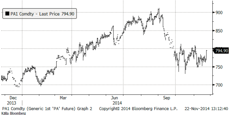 Vi fortsätter med neutral rekommendation på platina, men rekommenderar köp av palladium via t ex PALLADIUM S.