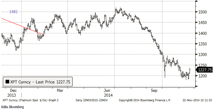 Platina har ökat i pris från förra veckans 1213 dollar till 1227.75 vid fredagens stängning. 1250 är ett motstånd, som marknaden måste passera innan man kan börja tala om trendvändning uppåt.