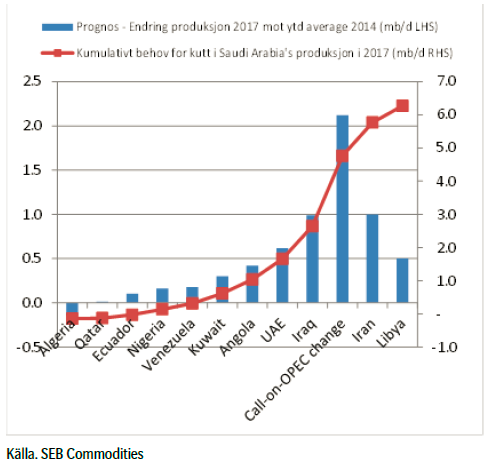Förväntningen på mötet i Wien den 27 november är att OPEC ska sänka produktionen. I själva verket har flera länder i OPEC behov av att öka produktionen, vilket ger ett kumulativt behov för Saudiarabien att reducera produktionen med 6 mpbp. Vi ser ett diagram över detta nedan.