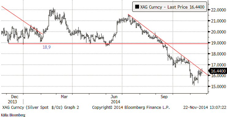 Silverpriset håller eventuellt på att bryta den fallande pristrenden, men än är det lite för tidigt att dra den slutsatsen.