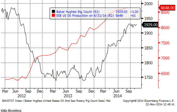 OPEC möts i Wien på torsdag, den 27 november. Redan den 24 november (när det här brevet skickas ut), är det deadline för Irans kärnvapenförhandlingar. Iran vill ha en komplett överenskommelse och inte ett delvis lyftande av sanktionerna. Vi tror att sannolikheten för en överenskommelse till måndag är liten och det verkar marknaden tro också. Om det skulle bli en överenskommelse, skulle det leda till +1 mbpd ökat utbud det närmaste året och det vore riktigt negativt för oljepriset. Ett besked om att ingen överenskommelse nås den 24 november ger å andra sidan säkert bara lite stöd för oljepriset.