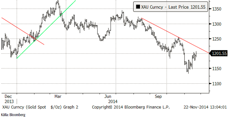 Platina har ökat i pris från förra veckans 1213 dollar till 1227.75 vid fredagens stängning. 1250 är ett motstånd, som marknaden måste passera innan man kan börja tala om trendvändning uppåt.
