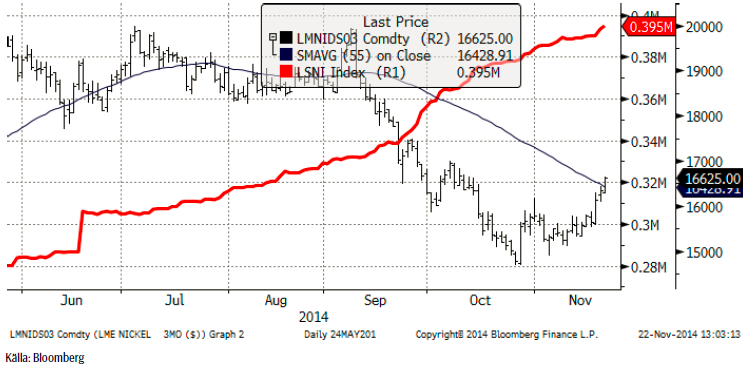 Nickelpriset steg starkt i veckan. Vi skrev förra veckan att det kunde vara dags för nickelmarknaden att vända uppåt – och det gjorde den med besked! Vi tittade på chartet och lagren och såg att priset verkade ha funnit en botten medan lagerökningen verkade ha tagit slut. Lagerökningen fortsatte faktiskt under veckan, så det var inte det som det handlade om. Icke desto mindre har antalet anullerade lagerbevis (warrants) ökat med 5000 ton mellan den 18 och 19 november. Det mesta skedde i Malaysia. Det kan vara ett tecken på en kommande vändning – och det är vad marknaden fokuserade på i veckan. Den utlösande faktorn var dock att den nya Indonesiska regeringen upprepade beslutet om exportstoppet. Vi erfar att uppgången handlar om en kombination av short-covering i terminsmarknaden och påfyllnad av lager hos industrin, som också legat ”kort” i förhållande till normal lagernivå. Tekniskt ser marknaden rätt positiv ut och indikerar högre pris på kort sikt. Brottet av triangelformationen i kombination med trendkanalsmotstånd pekar mot 17,000 dollarsnivån som mål.
