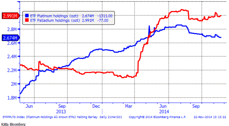 Nedanför ser vi hur mycket metall som finns i börshandlade fonder för platina respektive palladium. Investerare har sålt platina och köpt palladium den senaste veckan.