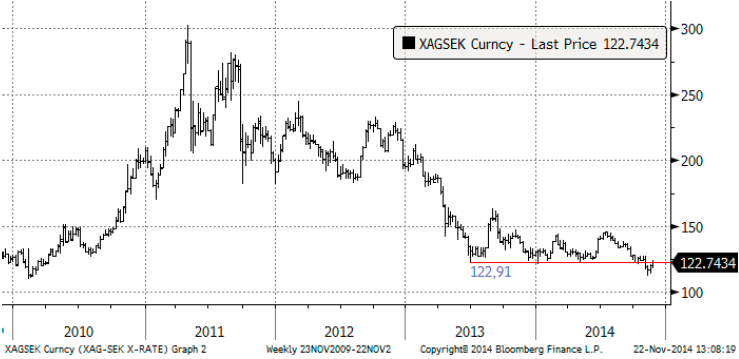 Silverpriset i kronor, nedan visat i ett veckochart, har stigit från120.53 kronor per uns förra veckan till 122.74 i fredags. Notera att motståndet vid 122.91 ännu inte är brutet. Den här uppgången är därmed mer av ett säljtillfälle. Skulle dock silver handlas i 123 eller något högre, måste man ta en stopp-loss på en position i BEAR SILVER X4 S. Tills vidare fortsätter vi dock att rekommendera köp av BEAR SILVER X4 S.