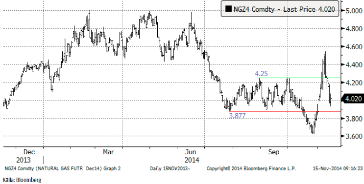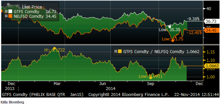 OPEC möts i Wien på torsdag, den 27 november. Redan den 24 november (när det här brevet skickas ut), är det deadline för Irans kärnvapenförhandlingar. Iran vill ha en komplett överenskommelse och inte ett delvis lyftande av sanktionerna. Vi tror att sannolikheten för en överenskommelse till måndag är liten och det verkar marknaden tro också. Om det skulle bli en överenskommelse, skulle det leda till +1 mbpd ökat utbud det närmaste året och det vore riktigt negativt för oljepriset. Ett besked om att ingen överenskommelse nås den 24 november ger å andra sidan säkert bara lite stöd för oljepriset.