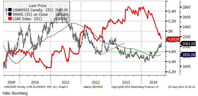 Den fundamentala balansen förbättras, som vi har skrivit tidigare. Frågan är emellertid om den produktionskapacitet som stängdes av före sommaren kan återstartas. Exempelvis frågar vi oss om den brasilianska produktionen, som sägs vara redo att återgå i produktion, kommer att göra det. Anledningen till att den stängdes före sommaren var huvudsakligen att elpriset där var ogynnsamt. Om man tar hänsyn till de höga fysiska premierna, erhåller aluminiumproducenterna runt 2450 dollar per ton för aluminium. Det är en nivå som historiskt har uppmuntrat producenter att öka produktionen.