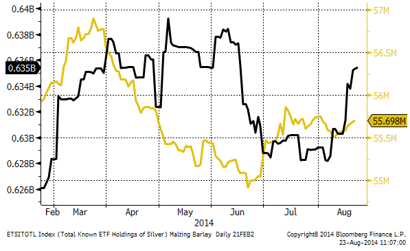 Nedan ser vi att det varit inflöde i guldfonder (gul kurva, antal uns i ETF:er) under den senare delen av augusti. Vi har även märkt av att svenska placerare köpt guld, inte bara GULD S utan även fysiskt guld, vilket vi kan hjälpa till med för våra private bankingkunder.