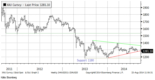 Nedan ser vi ett veckochart över guldprisets utveckling i dollar. Tekniskt stängde marknaden i fredags precis ovanför golvet i triangelformationen. Ett brott på nedsidan skulle kunna föra ner priset till 1250 i första hand och till 1180 i andra hand. Ett sådant brott av en så stor triangelformation innebär dock att priset i så fall skulle kunna fall ännu djupare.