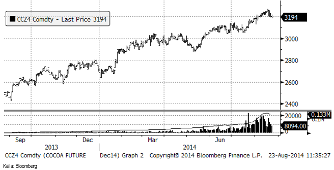En faktor som kan påverka priset positivt är spridningen av den fruktade sjukdomen Ebola i odlingsområdena, vilket har potential att åtminstone hämma transporter och export av kakaobönor.