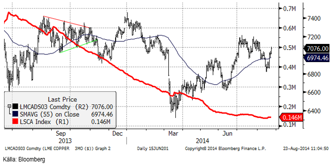 Prisuppgången på koppar i veckan överraskade de flesta. Tekniskt såg kopparmarknaden väldigt svag ut. De flesta rapporter lyfte fram risken för ytterligare säljtryck. Marknaden lyckades dock håla sig ovanför den mest kritiska punkten i fredags för en vecka sedan. När handeln öppnade igen på måndagen och marknaden verkade hålla emot på nedsidan, vände den istället upp. Det är svårt att säga exakt vad det var som utlöste haussen i onsdags, som lyfte priset på koppar från 6850 dollar till 7018 vid stängning. Kinas importstatistik visade att avmattningen fortsätter där. Importen av raffinerad koppar blev 245,000 ton i juli. Det är 16% under fjolårets nivå för samma månad. Trots att fundamenta ser ännu mindre positivt ut, vände priset alltså upp.