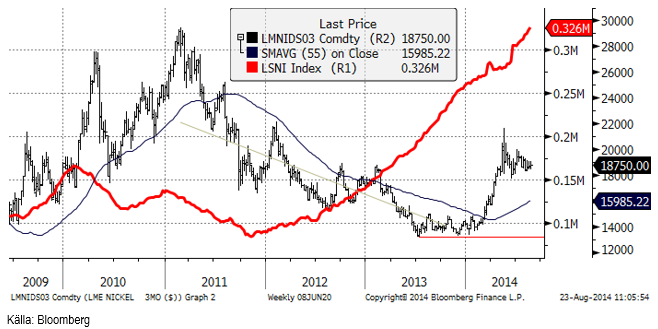 Vi har skrivit att bull-caset för nickel är intakt och behållit köprekommendationen. Vi tror dock att reaktionen i den fundamentala balansen och i priset har skjutits upp till senare i år, eller till början av 2015. Det varkar som om terminsmarknadens tålamod ändå håller på att prövas. Prisuppgången lyckades inte övergå i hausse, som i de andra basmetallerna. Tekniskt gjorde marknaden ett test av motstånden på ovansidan. Triangelformationen såg att vara bruten, men det utlöste inte den normala köpvågen som oftast följer på ett sådant tekniskt utbrott.