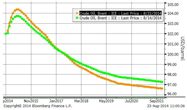 Det är intressant att notera att terminskurvan för brent har gått in i contango, ända till mars nästa år. Det tyder på ett överutbud på kort sikt. Vi vet också att man liksom för fem år sedan, lagrar olja på tanker i Nordsjön och i cisterner i Sydafrika. I diagrammet nedan ser vi att terminskontrakt för leverans nästa år gått upp i pris! Samtidigt har längre terminskontrakt, för leverans 2018 och framåt gått ner! Detta beror sannolikt på en oro för utbudsstörningar det närmaste året, t ex att Libyens export faller bort igen, och på att fracking kommer att sprida sig. Mexiko tog återigen flera kliv under föregående vecka mot att revitalisera oljeindustrin.