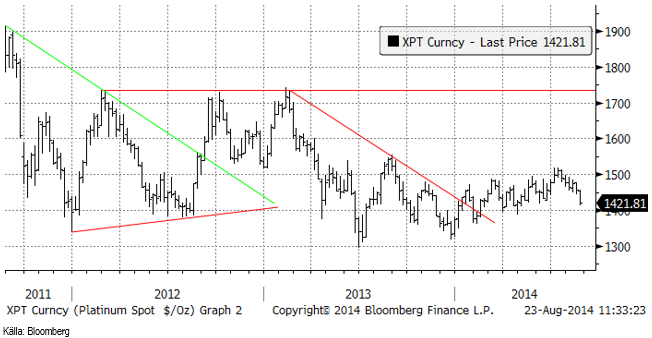 Förra veckan skrev vi att det finns risk för besvikelser, vilket kan leda till likvidering och kursfall istället för uppgång, om platina. Det var det som hände. Platinamarknaden drabbades av vinsthemtagningar och priset föll ner till 1422 dollar per uns när marknaden stängde i fredags. Förhoppningarna har varit stora på en ordentlig uppgång i platina och det finns sannolikt ännu en hel del material som kommer att komma ut på marknaden.