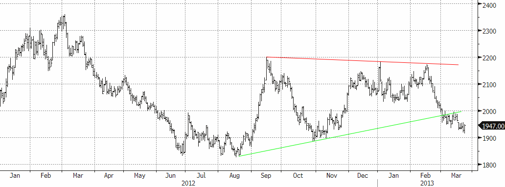 Under veckans inledning (i samband med nyhetsflödet kring Cypern) bröts även stödnivån $1975. Som lägst handlades nivåer i närheten av den starka stöd linjen, som kommer in strax över $1900. Det ”gamla” stödet utgör ett nu istället ett motstånd om det prövas underifrån. Tekniskt sett bör man avvakta lite för att se om trendlinjen håller, och bryter 1975 igen så är det ett köp. Fundamentalt är zinken ”billig” ur ett kostnadsperspektiv och nuvarande nivåer är intressanta på lite längre sikt (12 månader).