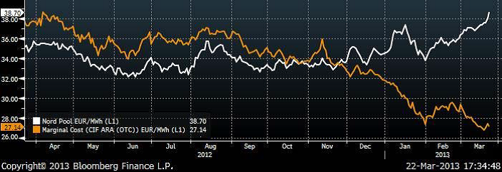 Bakom den senaste veckans prisuppgång ligger en hausse-artad prisuppgång i utsläppsrätter för koldioxid. Trots svagheten i marknaden för energikol, fick detta kostnaden för att producera el med kolkraft att gå upp. Nedan ser vi kvatalskontraktet på Nordpool (euro/MWh) som den vita kurvan. Den röda kurvan är kostnaden för att producera 1 MWh timme med kol och utsläppsrätter.