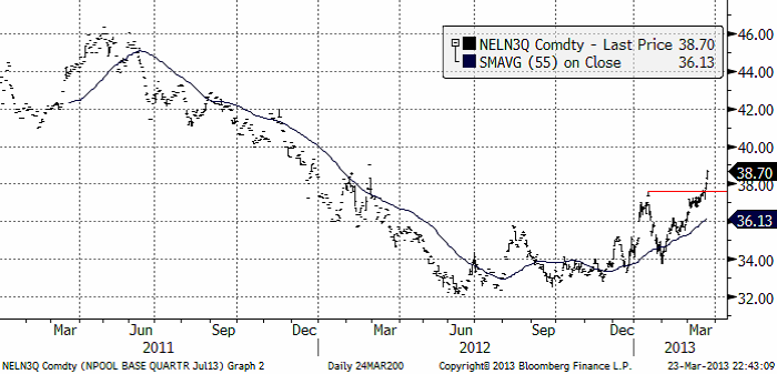 Priset på el gick genom motståndet vid 37.5 euro per MWh. Därmed bekräftades igen den positiva trenden. Vi går därför tillbaka till vår köprekommendation, något mer styrkta i vår tro på högre priser. Det förefaller som om botten på en den långa prisnedgången från vintern 2010/2011 har noterats. Vintern 2010/2011 handlades fast pris för ett kvartal på över 80 euro per MWh. Nedan ser vi den senaste kursutvecklingen i terminskontraktet för det tredje kvartalet.