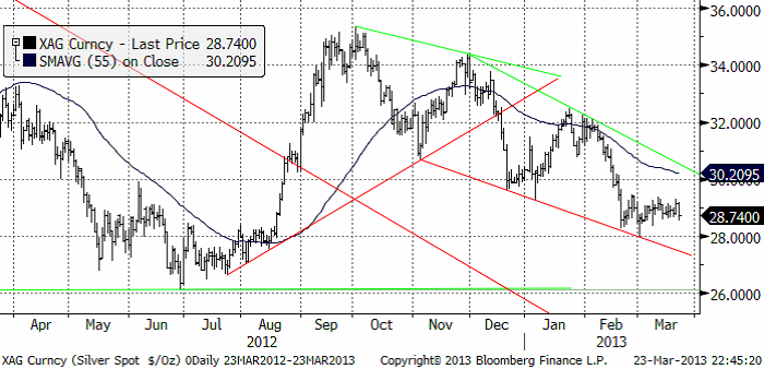 Nedan ser vi kursdiagrammet för silver i dollar per troy ounce. Priset har fortsatt att röra sig sidledes och inte markerat samma uppgång på Cypernkrisen som guldet. Silver visar därmed större trendmässig svaghet än guldet. Vi fortsätter därför att vara köpta BEAR SILVER X2/X4 S.