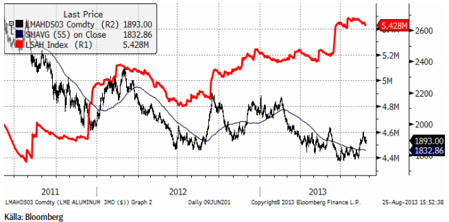 Det har under lång tid producerats mer aluminium än vad som efterfrågats och priset har legat under den nivå som krävs för lönsamhet. Under det första halvåret i år gjordes dock produktionsneddragningar i Kina på 600 – 700 tusen ton. Denna produktionsneddragning har dock ersatts av ny kapacitet. Rusal presenterade mer omfattande försök att åtminstone få marknaden i balans. När bolaget presenterade sin halvårsrapport, annonserade de produktionsneddragningar på 300 till 357 tusen ton. De uppmanade också branschkollegor att göra detsamma. De sade att 2/3 av global produktion var olönsam vid dagens priser. Alcoa var näst på tur att rapportera och de annonserade en neddragning på 200 tusen ton i Brasilien. Det finns mycket kvar att göra i en marknad som årligen har ett överskott på 500,000 – 1 miljon ton. Efterfrågan ökar med ungefär 6% per år. Premier för fysisk vara har sjunkit som en effekt av LME:s förslag som syftar till att korta köerna i LME-systemet. Vi förväntar oss en gradvis effekt på produktionen det kommande året – dvs successivt lägre fysiska premier och ytterligare produktionsneddragningar.
