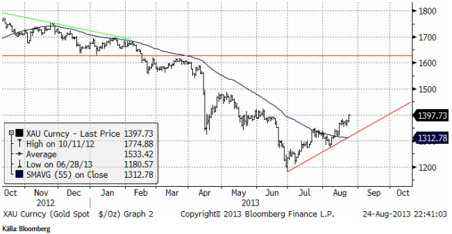 I det sista veckobrevet innan sommaruppehållet skrev jag att ”Tekniskt ser det ut som om uppgången har goda chanser att bryta igenom motståndet på 105 dollar och kanske gå upp mot 107 dollar i det mycket korta perspektivet av den kommande veckan. ”Vad vi fick var en uppgång till strax under 107 dollar, sedan en kraftig rekyl ner till 100 dollar och därefter en ny uppgång som fortfarande pågår. I fredags stängde spotkontraktet på 111.04 dollar. Som vi ser i diagrammet nedan, finns ett motstånd på 111.87 dollar, markerad av toppen i början på april och testad (höll) nu i augusti.