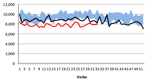 Däremot ser vi också att prognosen för 10 veckor framåt pekar nedåt. Den har varit en god indikator tidigare och uppvisar också trender.