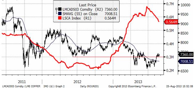 Kinas har länge hämtat material från sina lager som i mars var 1 miljon ton koppar. Nu har lagren nått ner till 300 tton. Kinas import har därför tvingats vända upp under sommaren. ICSG publicerade estimat i maj, som visade en efterfrågan större än utbudet (underskott) för första gången på 7 månader. Underskottet var 17,000, ton, men ändå ett underskott. De första fem månaderna i år visade på ett överskott på 250,000 ton. Under förra året var marknaden i underskott med 400,000 ton. Det tycks onekligen som om kopparmarknaden har blivit bättre balanserad än vad man tidigare trott. Vi tror därför att priset har gott stöd på nedsidan.