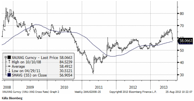 Nedan ser vi kvoten mellan guldpriset och silverpriset. När folk under 2011 trodde att en storbank sålt mer ”papperssilver” än vad som fanns i världen, gick kvoten ner till rekordlåga 30. Därefter har silver tappat mark dubbel så mycket som guld och kvoten nästan nått 70. Detta hänger ihop med baisse-marknaden. Silver brukar ta ut svängarna mer än vad guldmarknaden gör. När så vinden vände i augusti, har silvermarknaden varit snabbare än guldmarknaden. Silver handlar nu i linje med det historiska medelvärdet på kvoten till guld, som är ca 50. Idag är det alltså egalt om man köper silver eller guld.